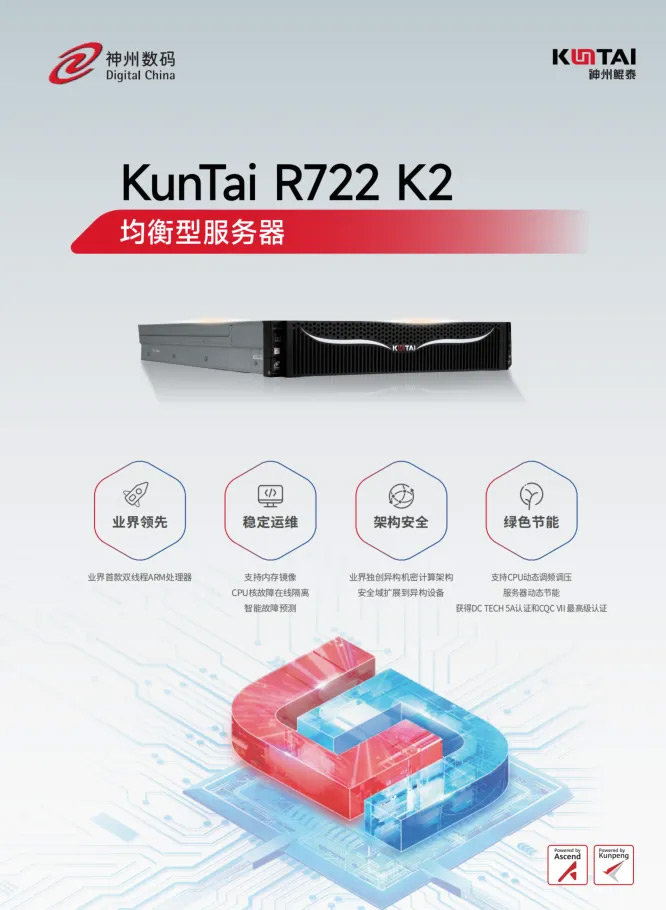 当下,行业数字化加速推进,算力需求爆炸式增长,已成为驱动产业升级的核心引擎。高性能、高安全、高能效、多样性算力是行业数字化转型对通用计算的普遍需求。神州鲲泰作为AI算力基础设施领域的深耕者,始终以技术创新回应市场需求。近日,搭载新款鲲鹏920新型号处理器的KunTai R722 K2通用服务器正式上市,这款融合了尖端芯片技术与成熟硬件架构的旗舰产品,将为云计算、大数据、人工智能等领域带来兼具高性能与高性价比的算力解决方案,重新定义国产通用服务器的性能标杆。